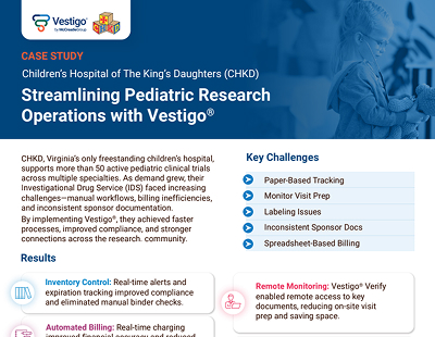 Vestigo® supports oncology pharmacy teams by providing a structured, digital approach to managing investigational drugs with confidence and consistency. Built alongside research pharmacy professionals, Vestigo® helps teams reduce manual work, strengthen compliance, and stay focused on patient care in high-stakes environments.